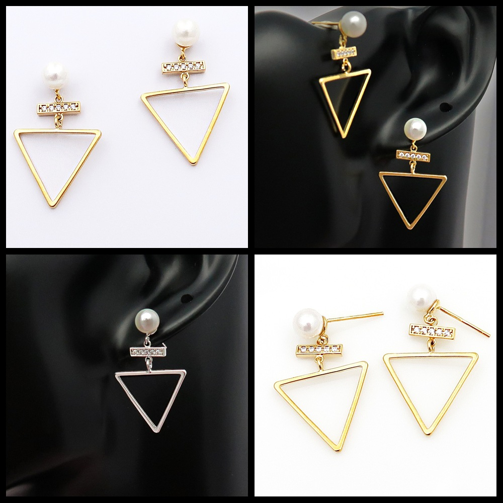 时尚流行黄铜水镀18K真金三角线珍珠耳环亚克力镶钻耳吊来样定制